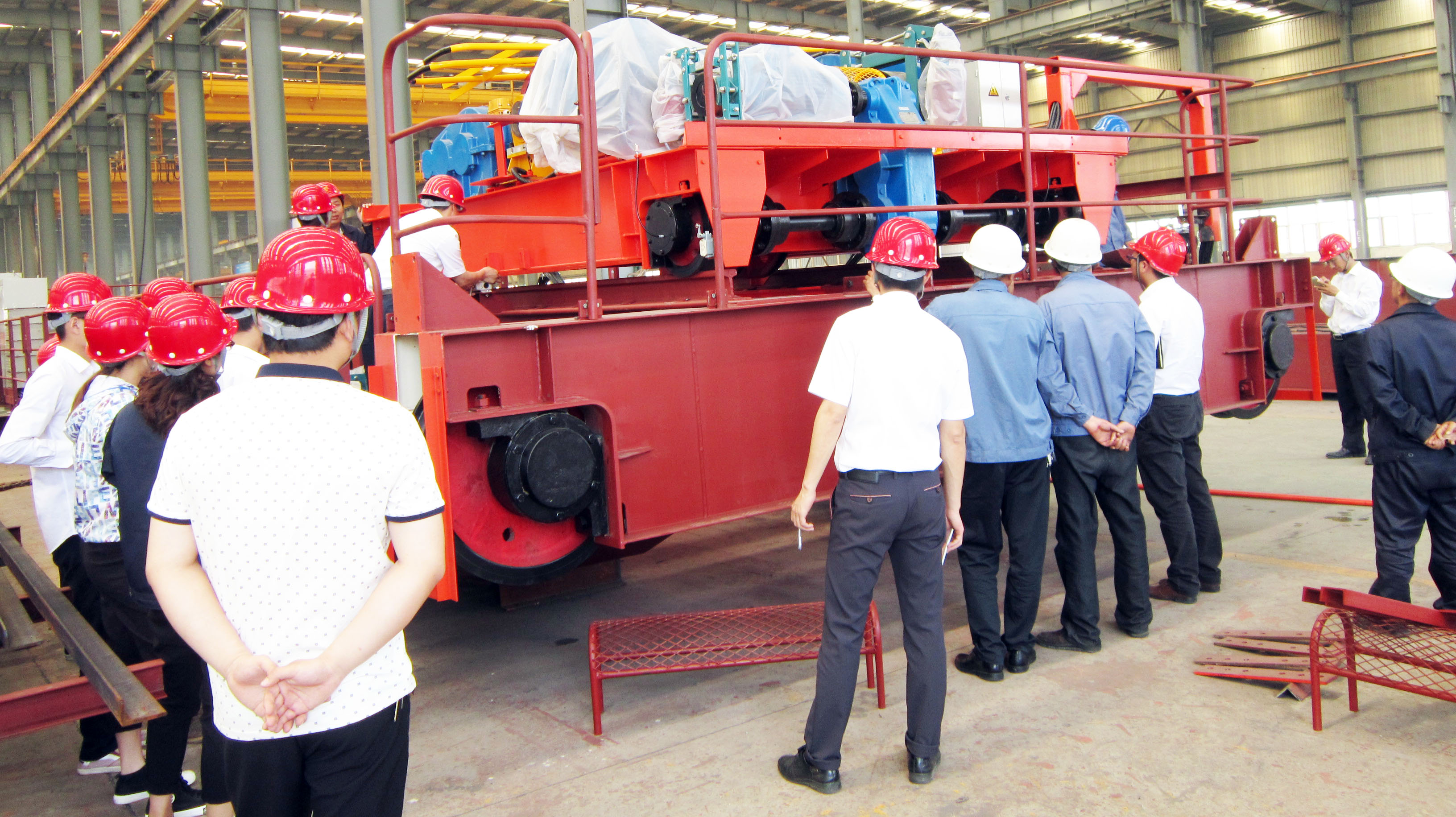 5月21日上午,大方公司總經(jīng)理胡旭、生產(chǎn)副總李曉寧帶領(lǐng)技術(shù)部、質(zhì)量保障部和生產(chǎn)班組長對已經(jīng)制作完畢的QD32/5t-22.6m雙梁起重機進行場內(nèi)組裝驗收、評審。胡總和大家一起來到現(xiàn)場認真查看評審樣機,評審過程中發(fā)現(xiàn)的問題大家相互討論,從電纜橋架的合理布置到電器柜底座的安裝,從小車運行的極限位置到限位開關(guān)、緩沖器的位置調(diào)整,從小車導(dǎo)電架的高度到小車安全底座的尺寸是否符合圖紙等等,大家都認真討論,暢所欲言,現(xiàn)場提出自己的整改意見。不知不覺兩個小時就過去了,評審現(xiàn)場的氣氛還是那么的濃烈,大家積極測量、實驗和討論,最終提出了近20條提升質(zhì)量的改進建議。